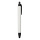 A ballpoint pen with a white, textured barrel and black accents on the tip, clip, and clicker. It is displayed in front and bottom views.