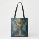 A beautiful angelic personalized tote bag with a beautiful angel with a turquoise marble background and a gold halo in an impasto style. Each side has an angelic quote.