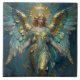 A beautiful angelic tile with a beautiful angel with a turquoise marble background and a gold halo in an impasto style.