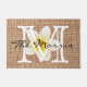 A beauty of nature summer design floral on a burlap doormat. A beautiful design, feels very natural. Background is an image of burlap and a white yellow floral. Big elegant initial monogram M in white and script black text. A cute monogrammed burlap design burlap.