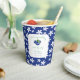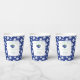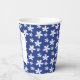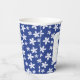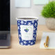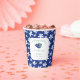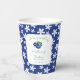 This is a customisable baby shower paper cup with a charming blueberry theme. The design features a blue border adorned with white daisy-like flowers, framing a central white square. Inside the square, there is an illustration of blueberries with green leaves, adding a playful and sweet touch. The text, written in a mix of cursive and print fonts, reads: "A berry sweet boy is on the way!" Below, in a complementary font, it displays the honoree’s name and the event date. The cup has a fresh, whimsical, and fun aesthetic, perfect for a blueberry or fruit-themed baby shower. It is customisable, allowing for the name and date to be personalised to fit any celebration.