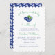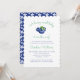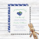This baby shower invitation has a sweet and playful blueberry theme. The background is white, decorated with blueberries and green leaves on the back is a white flower pattern on a bold blue background. At the top, in a fun, cursive-style font, the text reads, "A berry sweet baby is on the way!" Below, in a mix of elegant and playful fonts, the details of the event are listed, including the honoree’s name, date, time, location, RSVP information, and gift registry details. The overall design is charming, warm, and perfect for celebrating the upcoming arrival of a baby boy!