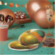 A photo of a bright and shiny holiday ornament for decorating your christmas tree. This festive ball, shaped like a hot air balloon, is coloured a seasonal green with cheerful pale orange stripes and is surrounded by golden stars and circles.