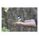 Photo of a black-capped chickadee sitting in a man's outstretched hand. The chickadee is eating a sunflower seed taken from the man's hand. A picture that illustrates the saying, "A bird in the hand is worth two in the bush".