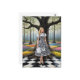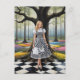 AI generated blonde woman in a black and white chequered dress on a black and white chequered floor in a colourful magical chequerboard forest