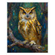 A beautiful photo print with a gold and blue owl sitting on a tree branch. This illustration has an impasto oil painting style.