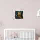 A beautiful poster with a gold and blue owl sitting on a tree branch. This illustration has an impasto oil painting style.