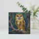 A beautiful blank card with a gold and blue owl sitting on a tree branch. This illustration has an impasto oil painting style.