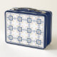 A blue and white metal lunchbox with a geometric pattern featuring star and cross shapes in a repeating design. The handle and latches are silver.