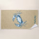 A drawing of a crab in blue is superimposed on a texured tan background on this ocean-themed beach towel. Perfect for your day at the beach!