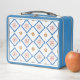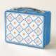 A blue metal lunchbox features a geometric tile pattern with alternating diamond shapes in blue borders and red floral motifs on a white background.