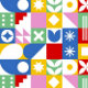 You see stars, circles, diamonds, stripes, and floral motifs, all arranged in a tidy grid. The palette is joyful and high‑contrast: red, blue, yellow, green, pink, and white pop vividly against the neutral outfit and soft background.