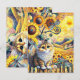 A whimsical scene features a cat sitting on a fence, surrounded by vibrant sunflowers and colourful dragonflies. The background includes rolling hills, a bright sun, and a playful arrangement of swirling patterns. Digital Art Photoshop CS5