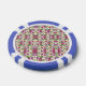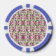 A casino chip features intricate floral patterns in pink, green, and purple on both sides, surrounded by a blue and white border, conveying elegance.