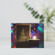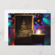 A lit candle sits in front of a card featuring a glowing Christmas tree, with colourful holiday lights softly illuminating the background. The warm light from the candle creates a cosy and festive atmosphere. This is photograph is by the Chief Photographer of God Bless the Keg Publishing LLC, Mr. Paul John Hausleben.