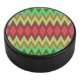 A circular speaker with a vibrant, zigzag pattern hockey puck