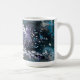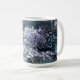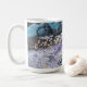 A unique coffee mug with an original artwork in blue, purple, and black by WestJack Studio. Designed in BC.