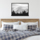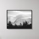 A black and white photograph of Mount Rainier. There are trees in the foreground. There are lenticular clouds forming and filling the surrounding sky at the top of the sleeping volcano. Image Copyright ©2023 Kimberly J Tilley. zazzle.com/store/developingnature