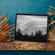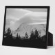 A black and white photograph of Mount Rainier. There are trees in the foreground. There are lenticular clouds forming and filling the surrounding sky at the top of the sleeping volcano. Image Copyright ©2023 Kimberly J Tilley. zazzle.com/store/developingnature