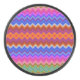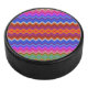 A colorful hockey puck features a vibrant zigzag pattern in shades of pink, orange, blue, and green. The design stands out against the puck's black edge.