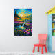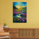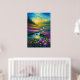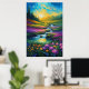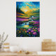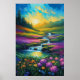 Witness the magic of a breathtaking sunset casting its warm embrace over a vibrant field. A picturesque stream rushes through the heart of the landscape, adding movement to the scene. The foreground is adorned with an array of colourful flowers, their hues dancing in harmony with the fading light. Immerse yourself in this idyllic moment where nature's palette and the serene stream unite in a symphony of beauty.
