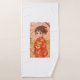 A bath towel designed as a cute little girl in a sakura garden wearing a lovely red kimono, desirable and worth purchasing.