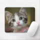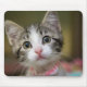 A mousepad with a tabby kitten with green eyes, with a blurry background