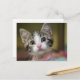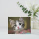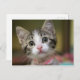 A postcard with a tabby kitten with green eyes, with a blurry background