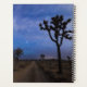 This photo features a starry sky and partial cloud cover above a desert road and joshua trees.
