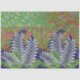 •	Top and Bottom Sections: These sections feature a textured, leaf-like pattern in shades of green and purple on a black background.