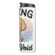 This cute illustration features a little brown puppy with big, round eyes, holding a steaming mug of coffee. The dog is positioned in a whimsical, cloudy setting. The words at the top and bottom read, "STARING Into the Void," giving the art a very funny and relatable feeling of being overwhelmed.