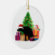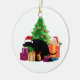 A playful Christmas ornament featuring a mischievous dog wearing a Santa hat, leaving a little 'gift' amongst the presents beneath a beautifully decorated Christmas tree. Santa himself is peeking out of a giant present, witnessing the cheeky scene.