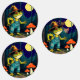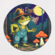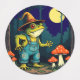 A Familiar Toad Witch Foraging At Night Illustration is a witchy design for Halloween. A familiar toad, wearing a witch hat and overalls, foraging for toadstools in a woodland. Ideal for mushroom hunters, mushrooming, and mushroom foraging. A fun design.