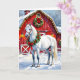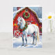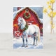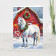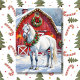 A pretty Christmas card with an illustration of a white horse standing in front of a gorgeous red barn decorated in Christmas lights and a festive wreath on a snowy winter day.