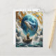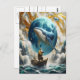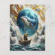 A surreal painting depicting a fisherman in a small boat, reeling in a giant blue whale that is connected to a swirling blue orb, all against a backdrop of golden clouds and dramatic waves.