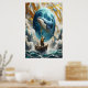 A surreal painting depicting a fisherman in a small boat, reeling in a giant blue whale that is connected to a swirling blue orb, all against a backdrop of golden clouds and dramatic waves.