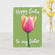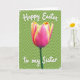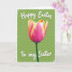 This card features a tall, single flower centered on the front, its cupped petals blending deep magenta into warm yellow along softly ruffled edges, like a sweet note shared between close friends. A slender green stem rises from the lower area, giving the layout a calm, steady base against a spring-green background. Behind the bloom, a gentle zigzag pattern adds motion, like a quiet conversation carried on a breeze 🌷. Bright, even lighting brings out the saturated color shifts and the fine petal texture without looking harsh. A lightly textured white border frames the artwork, giving it a soft, frosted look around the edges. At the top, a short Easter greeting appears in white brush-style lettering, and a smaller line of white text sits below the flower as a tender dedication 🐰. The background remains a fresh green field with the subtle wavy zigzag running horizontally behind the stem and bloom.
