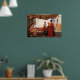 Warm reds, soft pinks, and deep greens draw your eye across the stall, while the pale walls and clear blue sky brighten the setting and make the colors glow. The careful balance of shadow and light gives the painting a tranquil mood, turning a simple marketplace interaction into something timeless, tender, and quietly romantic.