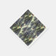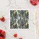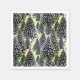 Paper napkins in a forest of snow covered Christmas trees, in black, white and grey, with a scattering of little red packages