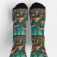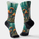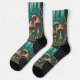 These crew-length socks echo the fantastical forest scene from the socks. On a light-coloured background, a mesmerising web of glowing mycelium threads spreads across the foot, mimicking the fairy ring formation. Pops of colour peek through the webbing, hinting at the vibrant mushrooms hidden beneath the forest floor. As the socks climb the calf, einzelne [individual] bioluminescent mushrooms can emerge, casting an ethereal glow.