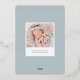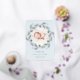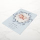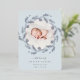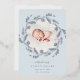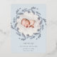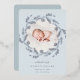 Elegant birth announcement in soft colours features a round newborn photo encircled by a wreath of silver foil botanical branches and leaves, with "introducing [Name]" at the bottom in chic grey lettering. Personalise with baby's birthdate, and birth stats beneath, and add a personal message to the back, along with an additional photo.