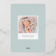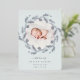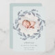 Elegant birth announcement in soft colours features a round newborn photo encircled by a wreath of silver foil botanical branches and leaves, with "introducing [Name]" at the bottom in chic grey lettering. Personalise with baby's birthdate, and birth stats beneath, and add a personal message to the back, along with an additional photo.