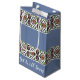 Decorative design print with blues, inky black, pink and orange,.