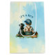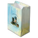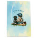 It's a boy gift bag for a baby shower or new baby gift. Blue and yellow baseball themed baby shower. A vintage baby boy sitting next to a dog, a Black Lab with a baseball cap, bat and glove. Blue and yellow background.