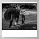 An inspirational quote is artfully juxtapositioned next to a gorgeous black and white photograph of a young girl leading her horse back to the barn after a summer riding lesson.