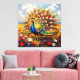 Peacock wall art. A pretty illustration of a peacock with beautiful gold and blue feathers standing in a field of purple, red and white flowers.
