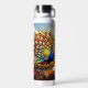 Peacock themed water bottle! A pretty illustration of a peacock with beautiful gold, green and blue feathers standing in a field of purple, red and white flowers.
