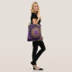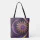 A golden sun and crescent moon with intricate patterns and designs in shades of purple, gold, and black tote bag