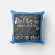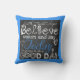 Our Good Day inspirational pillow features a text design using various fonts of white on a black chalkboard look background with a pop of blue for colour with a blue matching border! Text reads "faith...trust...hope Believe, waken and say Today is going to be a GOOD DAY"!