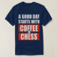 A good day starts with coffee and chess 1 .Funny, Family, Sports, Music, Education, Animals, Jobs, Names, Graphic, Tees Shirt, Funny Sayings, Vintage, Holidays, Gifts, party, souvenir, pride, vacation, clothing outfit apparel gift for Father's Day, Christmas, Birthday, Mother's Day, Anniversary, Graduation, Halloween, 4th of July, Retirement, St. Patrick's Day, Thanksgiving.
